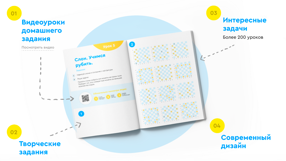 Преподаем курс по собственным учебным пособиям, чтобы ученику удобнее было выполнять домашнее задание по пройденному материалу. Программу составили таким образом, чтобы в течение года ребенок был готов достойно выступить на своем 1-м турнире.